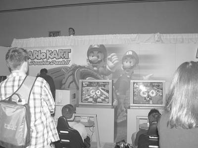 同在一个展区的任天堂也大打游戏牌。以白色为主旋律的展区内同时展出了NGC上的PIKMIN2、1080℃、FFCC、《刀魂2》、《MGS:双蛇》、STAR WARSⅢ、F-ZERO GX/AX、《瓦里奥世界》这8款NGC上一线大作的试玩版。并且NGC上的《马里奥赛车》连机8人对战部分还使用了罗技方向盘作为演示的策略之一。其他游戏,如《星际火狐》、PACMAN的4人作战DEMO也向玩家全面开放。在任天堂的另一大领域──掌机GBA SP在展区内以20种不同色彩不同款式同时展出。