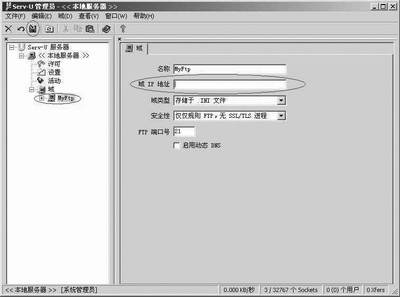 右击“域”,选“新建域”,在弹出的向导中参照“MyFtp”进行设置,只是在端口处一定不要与已经创建的“域”的端口或被其他系统服务占用的端口冲突即可。如果填入22,则此服务器的地址就是:ftp://218.1.1.1:22。依此而为,就可以架设多个FTP服务器了。