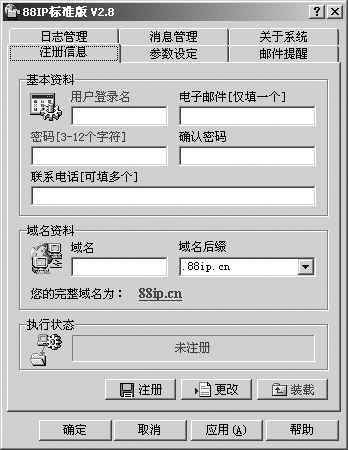 88IP需要付费注册才能拥有一个永久域名,如果免费注册则仅能试用15天。运行88IP标准版客户端,会弹出设置窗口(图4)。要获得一个域名,需要先注册。在“基本资料”中,依次填写好用户登录名、有效电子邮件地址、密码和联系电话,接下来就要选择你的域名,在“域名资料”中,“域名”框填入dys2,“域名后缀”下拉框里选择“88ip.com”,这时,下方的“你的完整域名为”会显示为dys2.88ip.com,确认无误后,点“注册”按钮注册。如果注册的用户名或申请的域名已经被其他用户注册过,软件会做出相应的提示,修改后再次注册即可。注册成功后,在“执行状态”中会显示“注册成功,用户ID:{xxxxxxxx}”,记下用户ID,以备将来缴费或需要技术支持之用。最后要点击“装载”按钮将刚刚申请成功的账户信息装载至本机上。