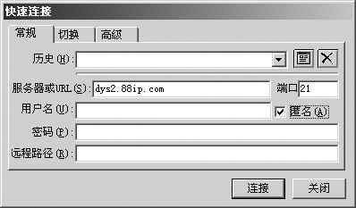 打开CuteFTP等FTP登录软件验证一下,在快速连接(图5)主机处填入刚刚申请的域名:dys2.88ip.com,点“连接”OK。关闭Serv-U和88IP客户端,断线再拨号上网,打开它们,再用FTP登录软件以dys2.88ip.com的域名连接。怎么样?方便吧!