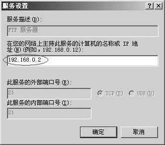3)由于系统默认FTP服务的端口是21,因而图6下面的端口处不可选,如果要自定义FTP服务器的端口,在“高级设置”窗口中单击“添加”,依次输入“服务描述”、“局域网IP地址”、“外部端口号”、“内部端口号”,确定后退出。