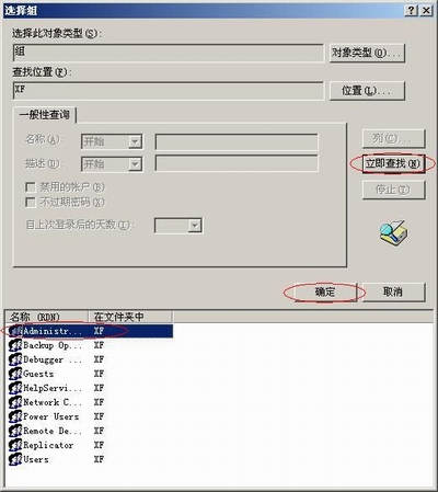 4)回到“计算机管理”,右击刚才创建的用户名,打开“属性”设置,在“隶属于”选项卡中先将默认的“Users”组删除,再点“添加”,在弹出的“选择组”窗口中点“高级→立即查找”(图8),在搜索结果中选择“Administrators”组,然后确定就可以了。