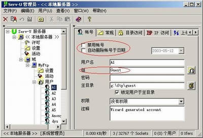 “最大上传速度和最大下载速度(KB/秒)”:用来设置该账户用户最大的上传/下载速度。对于特定账户,可以设置得比一般账户高些,以体现特权。