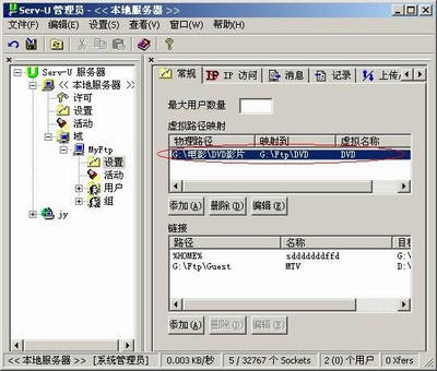 很多时候,上传的文件多了,架设服务器当初设定的主目录所在盘空间往往就不够了,怎么办?这就需要设置虚拟目录。虚拟目录就是将其他目录以映射的方式虚拟到该FTP服务器的主目录下,这样,一个FTP服务器的主目录实质上就可以包括很多不同盘符、不同路径的目录,而不会受到所在盘空间的限制了。当用户登录到主目录下,还可以根据该账户的权限对它进行相应的操作,就像操作主目录下的子目录一样。如果用户被锁定在主目录下,这项功能将允许他们访问主目录之外的其他目录。