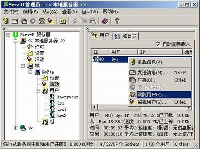 “踢除用户”:不管用户是否在上传或下载文件,将该用户踢除本服务器。