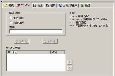 如果想将自己的FTP站点仅供几个特定的用户使用,可以选中“允许访问”,在“规则”中输入特定用户的IP,再点“添加”。同样,如果特定用户的IP是动态IP,可以使用通配符和“-”符号进行设置。