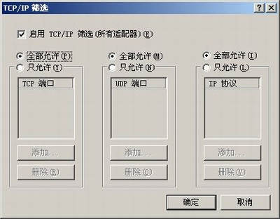 在Windows 2000和Windows XP中,系统都带有TCP/IP筛选功能,利用它可以简单地进行端口设置。以Windows XP为例,打开“本地连接”的属性,在“常规”选项中找到“Internet协议(TCP/IP)”,双击它打开该协议的属性设置窗口。点击右下方的“高级”按钮,进入“高级TCP/IP设置”。在“选项”中选中“TCP/IP筛选”并双击进入其属性设置。这里我们可以设置系统只允许开放的端口(图21)。假如架设的FTP服务器端口为21,先选中“启用TCP/IP筛选(所有适配器)”,再在TCP端口选项中选择“只允许”,点“添加”,输入端口号21,确定即可。这样,系统就只允许打开21端口。要开放其他端口,继续添加即可。这可以有效防止最常见的139端口入侵。缺点是功能过于简单,只能设置允许开放的端口,不能自定义要关闭的端口。如果你有大量端口要开放,就得一个个地去手工添加,比较麻烦。