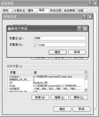 首先打开“系统属性”窗口,切换到“高级”选项页,选择“环境变量”按钮,打开图4窗口,将TEMP、TMP两个用户变量的值更改为“J:\Temp”,这样系统中的所有临时文件就会存储在Ramdisk这个虚拟磁盘中,更妙的是以后再也不用担心临时文件不会被自动删除了。