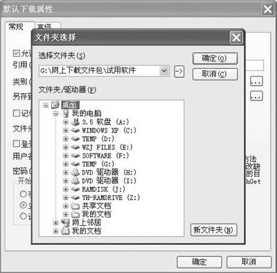 笔者使用的是FlashGet,因此从“工具”菜单下打开“默认下载属性”窗口(图6),将下载路径设置到虚拟磁盘中,以后下载时就不会听到硬盘发出的吱吱声了。不过在关机前当然还是需要将下载文件转移到物理磁盘中,否则就会再也找不到哟。