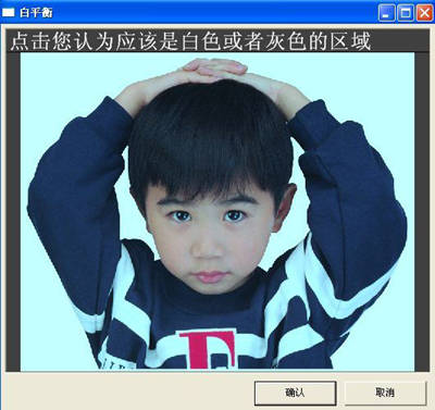 点“偏色”选项后,马上会弹出调整颜色“白平衡”的选项(图3),这时你可能会说我不懂什么白平衡、黑平衡什么的。没关系,界面的上方有提示,你只要用鼠标点击画面中你认为是白色或者灰色的地方。完全根据你的判断来调整颜色,一次没关系,你可反复多次操作,直到你满意位置。