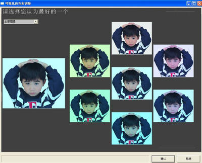 如果你还对自己调整色彩的能力不是很相信,那你还可以点左边的“色彩调整”选项,在色彩选项的弹出的窗口中会提供给你几种色彩调整的选项(图4),我们就选第一个“从一组中选择一个”选项,接着就弹出可视化的色彩调整窗口(图5)。这里就选择你刚才在调整过程中色彩效果好的图片,哪一幅图片最满意了吧?