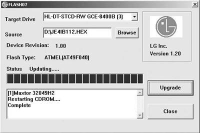 上述升级方法既适用于LG 40×,也适用于LG 32×超频至LG 40×的刻录机,不过在将固件升级至1.12后,以后不管是读盘,还是刻录光盘,都将只有写指示灯亮,读指示灯将不亮,成了“独眼龙”。好了,使用LG 40×的朋友们赶快开始动手吧!