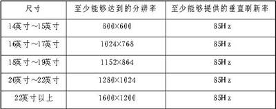5.对各尺寸的CRT显示器在各分辨率下必须达到的垂直刷新率进行了规定(见下表)。