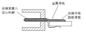 找到了故障点,接下来就是想法修复了。首先找一段长约2厘米、线径约1毫米的多股铜芯导线,去掉塑料外皮后将铜芯绞合紧密并对折,用手钳适当压紧,使其尽量适应空心针脚的内孔孔径,然后将它对折的一端插入空心针脚内孔一直到底,以不松动为原则,最后将导线末端与用细砂纸去掉保护漆的A侧覆铜面焊牢即可。如图2所示: