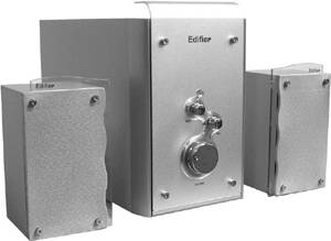 漫步者R331的卫星音箱设计得另类而别致,全木结构的箱体蒙上了一层金属灰色的蒙皮。最为特别的是卫星音箱采用了两分频单元结构。中音扬声器单元采用的是爱德发自己研发的3英寸优质纸盆扬声器,高音单元依然是PV膜球顶高音扬声器,都采用了全内磁设计。优秀的分频设计使得它的高中音效果更为分明。低音炮选用了5英寸的低音扬声器,采用了两腔设计,前腔密闭喇叭朝后,倒相孔被安置在后腔,侧面导风,这样的好处是能使低频更干脆地喷出,不会出现发闷的感觉。低音单元正面的金属铝面板为低音单元增添了不少时尚气息。同时在低音炮金属面板上配有亮色的调节旋钮,接通电源后蓝色LCD灯发出荧荧的蓝光,显得非常时尚。R331T拥有不错的低频动态和中高音表现,因此比较合适听歌曲或者播放轻音乐。