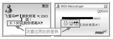 回到聊天窗口中,再次选择表情符号时,在“Show More Emotions…”上面便会看到自己定制的表情符号。如果对方也使用6.0版本,当你选中自定义的表情符号发送过去后对方也可以看到。这这个版本在表情符号方面的变化还有一个,那就是当对方首次给你发送包含表情符号的消息时(你的聊天窗口还没有打开),不会再像以前版本那样将表情符用文字表示,而是直接使用图形表示了。两个版本的比较如图1所示。