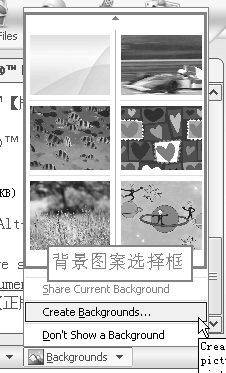 和以前版本相比,修改聊天窗口的背景变得十分容易,而且可以和同样用6.0版本的好友共享同一背景。步骤为:在聊天窗口中单击“Backgrounds” 弹出背景选择框(图2),你既可以在这里选择软件自带的几个背景图案,也可以单击“Create Backgrounds…”自己设计背景──所要做的就是在随后出现的“My Backgrounds”窗口中点击“Browse”按钮找到图片让它出现在列表中,然后选中一个图片,单击“OK”按钮关闭窗口后,你的窗口中的背景图案马上发生变化;希望对方分享这一背景则单击“Backgrounds”→“Share Current Backgrounds”请求对方确认,对方同意后此背景便传给对方,这样你们双方的背景便一致了。(注意:在多人聊天模式下不支持分享背景。)