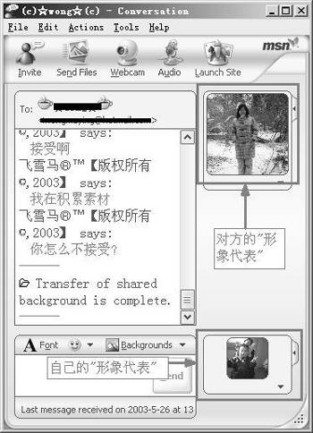 在6.0版本中,你可以随时将自己的“形象”图片让对方看见。先请大家看一看图3,这是一个典型的6.0版的聊天窗口,在右上方显示的是对方好友的形象图片,右下方则是自己的形象图片。设置该图片的方法是:单击右下方图片区域,然后在“My Display Picture”窗口中点击“Browse”将图片找到,选中一个图片后单击“OK”返回聊天窗口。这样,在聊天过程中,对方便可以看到你的形象图片了。
