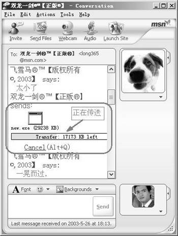 要给对方传送文件,则点击工具栏上的“Send Files”按钮发出请求,对方点击“Accept”或者“Save as”均可表示接受,而“Decline”则表示拒绝接受;当开始传送文件时,聊天窗口中会有进度指示(图5),传送完成,会出现“You have successfully received XXX from XXX”的提示,点击窗口中的“Open”可以打开该文件。需要指出的是,以前版本的Messenger收到文件后会提示你检查病毒,而在这个版本中经过设置可以自行检查病毒,方法是在主窗口中点击“Tools”→“Options”,打开选项设置窗口,进入“Messenger”选项卡,在“File Transfer”下设置──选中“Scan files for Virus using:”并在下面填写杀毒软件的位置及主文件名。