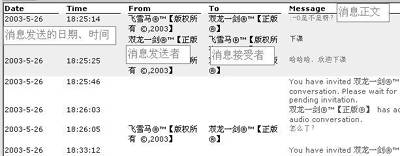 以后,和好友聊天的对话内容(其实是聊天窗口中的所有信息)会被记录到所选择位置下的扩展名为.xml的文件中(主文件名为对方登录所用的passport地址),如果要查看聊天内容,只需要双击该.xml文件会自动在浏览器中打开。图7(图上已标出相应项目的中文意思)。为所记录的谈话内容的片段,从中可以看到它用两种不同的颜色来间隔两次谈话(即分别打开两次聊天窗口的内容)。