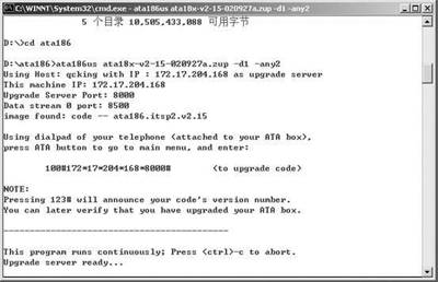 第三步,把电话接到ATA-186上,拿起电话听筒听到系统提示音后,在电话按键上键入100#<ip_address_of_PC>*8000#。系统就会自动上传升级文件并告诉你系统升级成功。