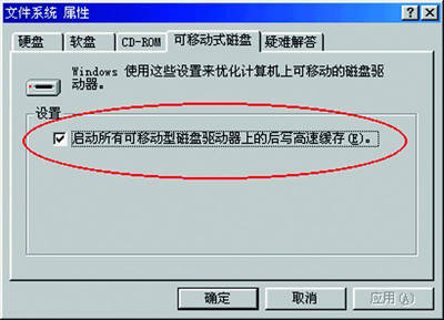 在Windows XP下可以通过打开“我的电脑”,右键单击可移动磁盘,选择“属性→硬件”,再选中闪存所在的磁盘驱动器,单击“属性→策略”,选中“为性能而优化……”的对话框,点击“确定”即可。