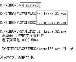 对于被病毒感染的文件,我们一般都要到纯DOS环境下进行删除,其实在故障恢复控制台中我们也可以完成这个操作。比如被“冰河”感染的Windows XP系统,会在“WINDOWS\SYSTEM32”目录下产生Kernel32.exe和Sysexplr.exe文件,我们可以这样清除它们:进入故障恢复控制台,在命令行中键入“cd system32”,回车之后进入System32目录,用Del命令将它们一一删除,这样再用Dir命令查看时你会发现它们都消失了(如图6所示)。
