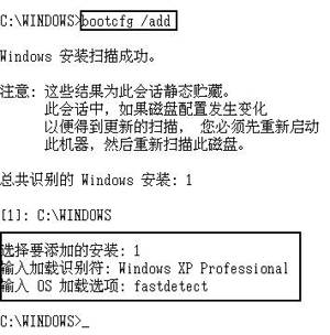 因为安装了多个操作系统,比如先在C盘安装了Windows 98,后在D盘安装了Windows XP,这样就会自动产生一个多重启动菜单。但是如果颠倒了两个系统的安装顺序,该菜单就会被破坏。我们可使用安装光盘中的控制台,再通过Bootcfg命令来修复:启动控制台后键入“Bootcfg/scan”命令扫描安装的Windows XP系统并显示结果。如果识别到Windows XP系统(一般显示为[1]: X:\WINDOWS,X表示已安装XP的驱动器),就可以使用“bootcfg/add”命令来添加安装的项目,在“选择要添加的安装”后输入识别的编号(比如1),回车之后在“加载识别符”后输入“Windows XP Professional”(菜单名称),回车之后在“OS加载选项”中输入“fastdetect”(如图7所示),在回车并重启电脑后,你就能看到多重启动菜单了。