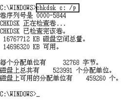 通过Chkdsk命令我们可以对磁盘进行检查并显示状态报告(比如磁盘总容量,可用空间等),还可以找到磁盘的坏扇区并纠正其中的错误。比如我们可以键入“chkdsk c:/p”,回车之后就会对C盘进行强制性的彻底检查(如图8所示)。