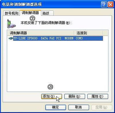 ②在打开的“电话和调制解调器选项”窗口中,单击“调制解调器”选项卡,再单击“添加”按钮。