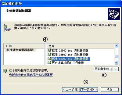 ③在打开的“添加硬件向导”的窗口中,在“厂商”列表框中选择Modem的生产厂商,在“型号”列表框中选择Modem的型号。如果找到了就单击“下一步”直接进入第⑥步。