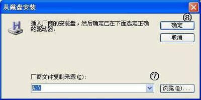 ⑤在打开的“从磁盘安装”对话框中,将装有驱动程序的软盘插入软驱中。如果驱动程序放在光盘中,就单击“浏览”按钮,在打开的对话框中选择程序所在的路径。然后单击“确定”按钮,关闭对话框。