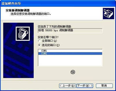 ⑥在打开的对话框中,选择Modem所连接的端口,单击“下一步”按钮。