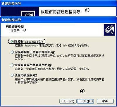 ③打开“新建连接向导”,单击“下一步”按钮。选择“连接到 Internet”,然后单击“下一步”按钮。