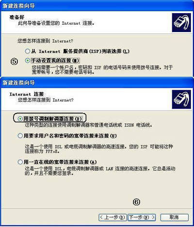 ⑤选择“用拨号调制解调器连接”,单击“下一步”按钮。
