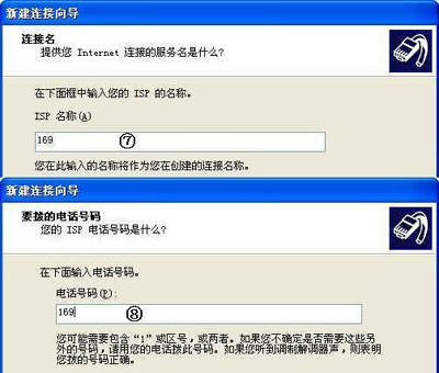 ⑥输入ISP名称“169”,这只是一个表示连接的名称。单击“下一步”按钮。
