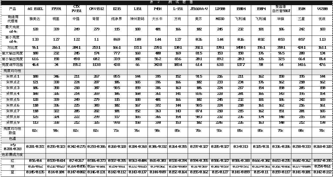在显示器的色彩表现的测试中,将显示器设置为出厂预设值,在MPRⅡ规范中9300K色温下,在中心取样。在MPRⅡ规范中,纯白色的定义是x=0.281,y=0.311,测试数据越接近该值,则表明显示器的白色还原能力越好。同样,我们也可根据此方法得到红、绿、蓝三原色下的测试数据。对于红色是,x值越大越好;对于绿色是,y值越大越好;对于蓝色是,1-x-y值越大越好。