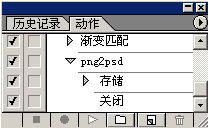 2.将PNG序列文件转换为PSD文件。这个过程比较麻烦但却是不得不完成的。首先我们把PNG文件一个一个打开,然后另存为PSD文件就可以了。其实PNG本来就带有透明通道,但由于视频编辑软件Premiere不支持PNG文件,所以无法导入。另外本来我们也可以用ACDSee将它一次性转换为TGA文件,但导入Premiere同样没有透明通道。最后的办法只有采用另存为PSD的笨办法了。因为同属一家公司旗下,所以Adobe Premiere对PSD文件的兼容性非常好。另外,由于一个一个文件另存为太辛苦了,而一个动画输出来一般都有上百个PNG文件,所以我们可以采用Photoshop动作功能,(如图1所示)。你再为这个动作设一个快捷方式,如F2。这样一来,你只需要把PNG文件全部在Photoshop中打开,然后不停地按F2就可以了。