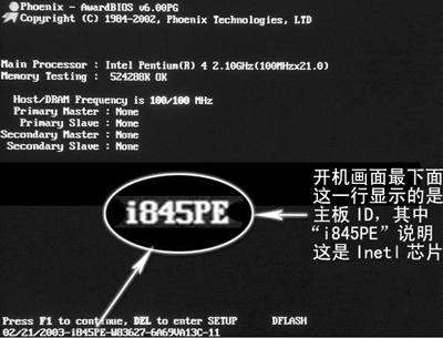 目前主板芯片组主要有Intel、VIA、SiS等几家,它们都有各自的主板驱动程序。因此在安装主板驱动前,首先要确定当前主板所使用的芯片组品牌和型号。如果主板的包装盒、说明书还在的话,可以通过查看它们从而获知主板信息。另外,当启动电脑进行自检时,也能在启动画面中看到当前主板所使用的芯片组品牌及型号(图1)。
