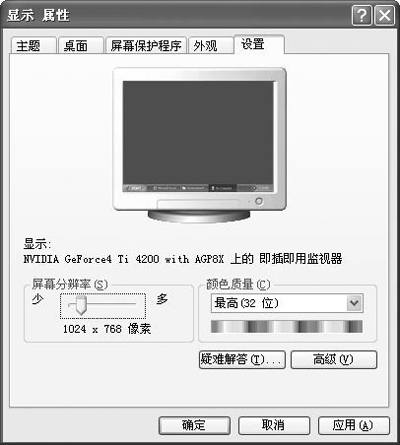 安装好显卡驱动之后,还得对显示系统进行基本的设置才行。右键单击桌面,在弹出的右键菜单中选择“属性”,等进入“显示属性”窗口后,点击“设置”标签,然后拖动“屏幕分辨率”选项上的滑块,根据显示器的大小来选择分辨率的大小(一般15英寸设为800×600,17英寸设为1024×768);点击“颜色质量”选项的下拉菜单,设置为“真彩色32位”(图4)。