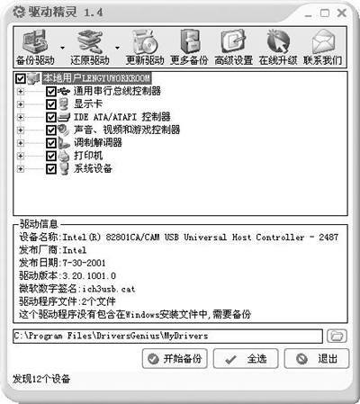 安装好驱动之后,建议对驱动进行备份,万一驱动光盘丢失或者重新安装操作系统,也能够快速安装好驱动。当然,手工备份/恢复安装驱动都很麻烦,建议使用《驱动精灵》,下载地址:http://www.mydrivers.com/dir67/d26903.htm。