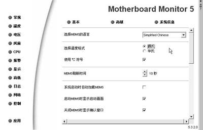 所以这里我们要介绍通用的温控软件──MotherBoard Monitor5(以下简称MBM5)。大家可以在“http://download.pchome.net/php/download2.php?sid=9154&url=/system/monitor/mbm5320.exe&svr=4”下载。MBM5的安装很简单,安装完后需重启系统。