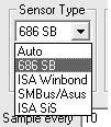 Vcool启动后在系统任务栏上会有一个小图标,并实时显示当前CPU温度,用鼠标右键单击选择“Options”打开Vcool的设置窗口。首先我们在“Sensor Type”(传感器类型)下选择主板所采用的温度监控芯片类型,单击这个下拉列表可以看到其中有Auto、686SB、ISA Winbond、SMBus/Asus、ISA SiS几种类型(图4),设置成“AUTO”可以让Vcool自己监测温控芯片类型。