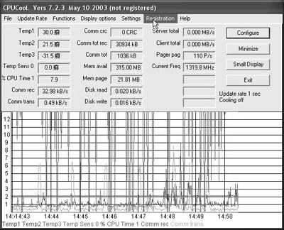 “Sample every Second”用来设置Vcool监测CPU温度的时间间隔,这个时间设置一般设置为10秒就可以了。如果要实时了解CPU的温度,我们可以将这个时间尽可能地减小,有必要的话可以设置成1秒间隔,不过这会多占用一些系统资源。