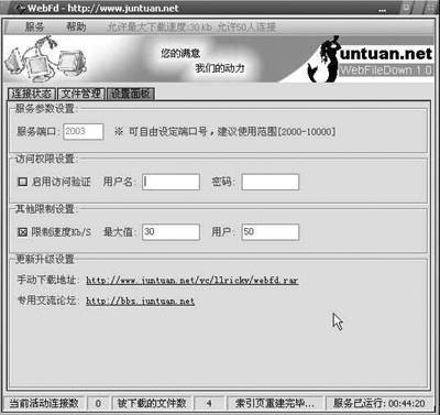 大家在看过很多FTP建站的文章后,一定也拥有了自己的FTP站点。想不想再建立一个HTTP下载站呢?这里我就为大家推荐一款建立HTTP下载站点的绿色软件──WebFD。