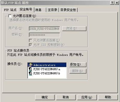 4.在所创建的FTP站点上点击鼠标右键,从弹出的对话框中选择“安全账号”页面,取消“允许匿名连接”选项。在“FTP站点操作员”目录框中点击“添加”按钮,从弹出“选择用户或组”对话框中加入相应用户名,即用户user1、user2,接着连续点击“确认”,返回到“Internet信息服务”界面,操作完成后页面如图1所示。