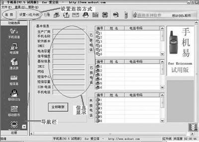 《手机易》的界面很简单(图3),首先在工具栏中设置连接端口或者连接方式,我们选择红外线。点击“连接“后,在《手机易》的主窗口中就会显示出手机的一些基本信息和电话簿,通过点击左边的导航栏按钮就能进行相应的操作。整个软件使用非常“傻瓜“化,很容易上手。