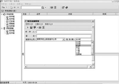 《玩转手机》是一款针对利用PC与手机连接进行短消息发送、接收的软件,笔者觉得用它来弥补《手机易》不能发送短消息的缺陷再合适不过了。利用《玩转手机》可以方便快速地浏览和发送短消息,而且连接非常稳定。在《玩转手机》中分本地信箱和手机信箱两个板块,通过连接后《玩转手机》会将手机内的短消息读取到手机信箱中并且显示,同时也备份到本地信箱,即使你将手机内的短消息进行了删除,也不会破坏本地信箱中的数据,除非你在本地信箱中选择删除。这样我们就可以把平时一些需要记录的短消息存储在计算机上了。《玩转手机》在编辑发送短消息时还可以设置发送的有效期(图4),在字数上也有控制,超过了范围将自动截断。软件的下载地址:http://file2.mydrivers.com/tools/mobile/wzsj_setup.exe