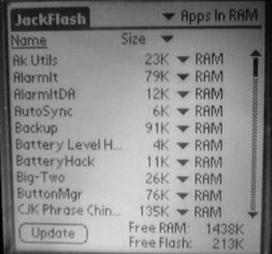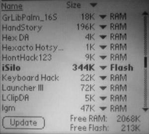 下面就可以开始往ROM移入程序了,每次可以选择并移动一个或多个程序。比如我们想把著名的阅读软件iSilo移入ROM,只要在程序列表中找到iSilo,然后在程序右侧的下拉菜单中选择“Flash”,这时该程序名称就会变成黑体显示,表明准备移动到ROM中去,屏幕右下角显示的RAM和ROM的剩余空间也相应地发生变化。最后点击右下角的“Update”,经过短暂的等待以后,该程序就被写入到ROM中了(图3)。如果想看看移入ROM中的程序,只要点击屏幕右上角并选择“Apps In Flash”就可以了。