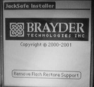 当你的机器Hard Reset以后,就会发现一个新问题:移入ROM中的程序并没有显示出来,只能再一次运行JackFlash才能使系统认出移入ROM中的程序。对此该怎样解决呢?此时JackSafe就派上了用场。JackSafe和JackFlash来自同一个公司──Brayder公司,它只有一种功能,就是在ROM中写入一段代码(大约占用64KB的ROM空间),从而在Hard Reset以后,使系统能够自动认出JackFlash移入ROM中的程序,这样就再也不怕Hard Reset了。如果想删除该段代码,只需要再次运行JackSafe然后点击“Remove Flash Restore Support”就行了(图4)。